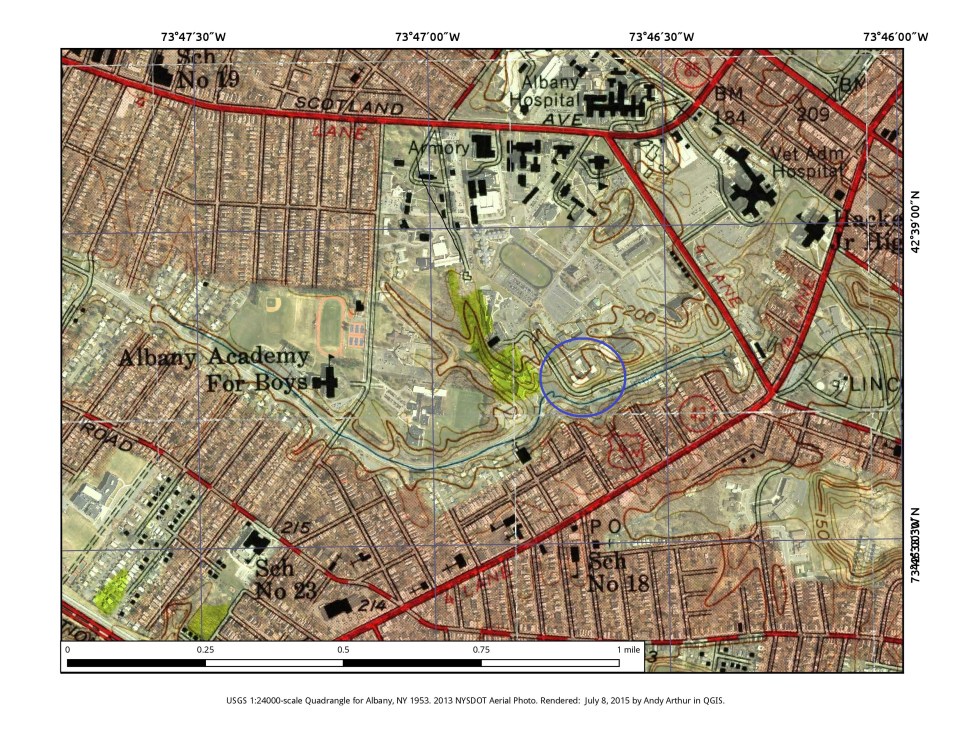 aerial-underlay with blue circle ← Previous 1953 topographic map with 2014 aerial photograph underlay (Credit andyarthur.org)