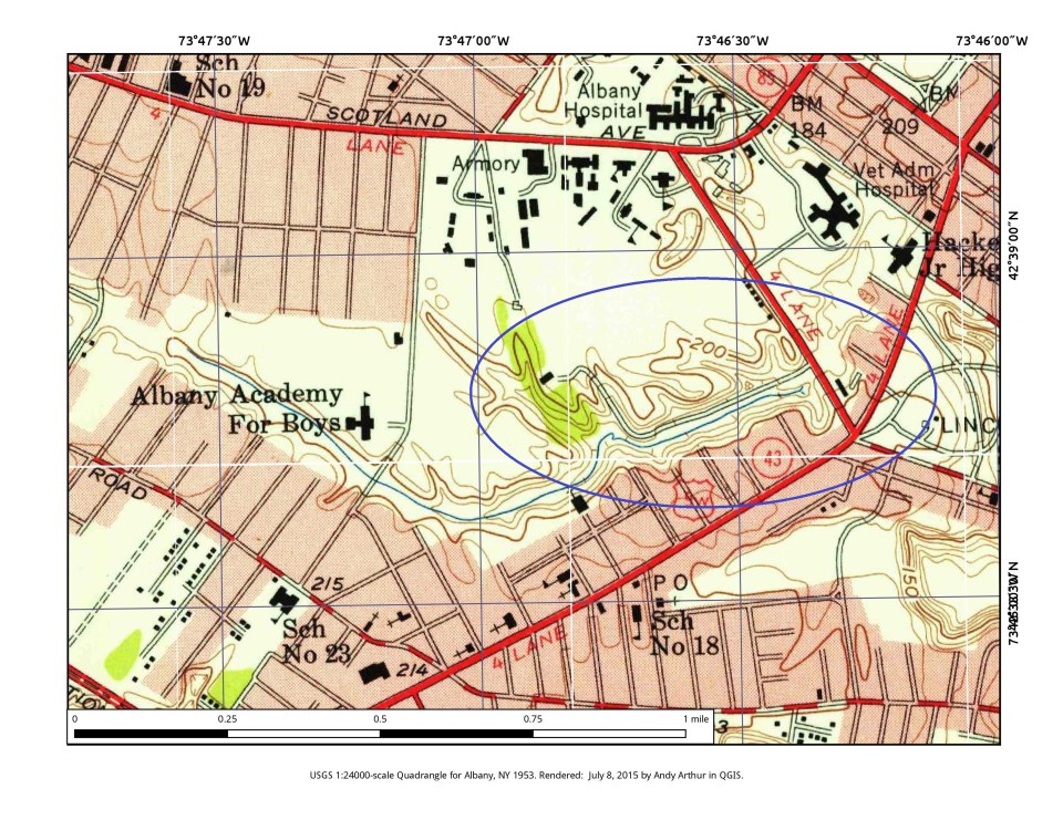 topo-only with blue oval ← Previous Next → 1953 topographic map of Albany’s University Heights section (credit andyarthur.org)