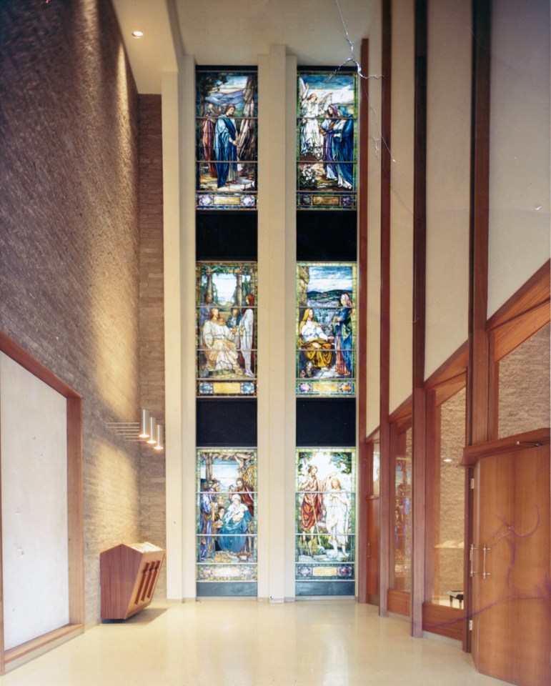 IMG_0009 v001 ← Previous Next → Early photograph of the Hackett Boulevard narthex, with stained glass windows.