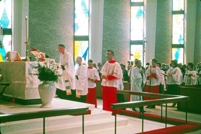 The two servers at the altar wearing red cassocks are Robert Peters and Richard Green. The one torch-bearer visible is David Van Hattum and the crucifer is John O’Meara.