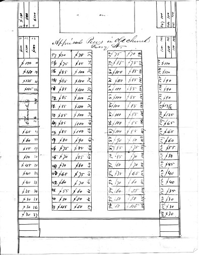 These descriptions are supplemented by a diagram from the 1830s, showing the appraisals of pews on the building’s first floor. At the front is a large rectangular area. This is the chancel, containing pulpit, reading desk, screen and altar.
