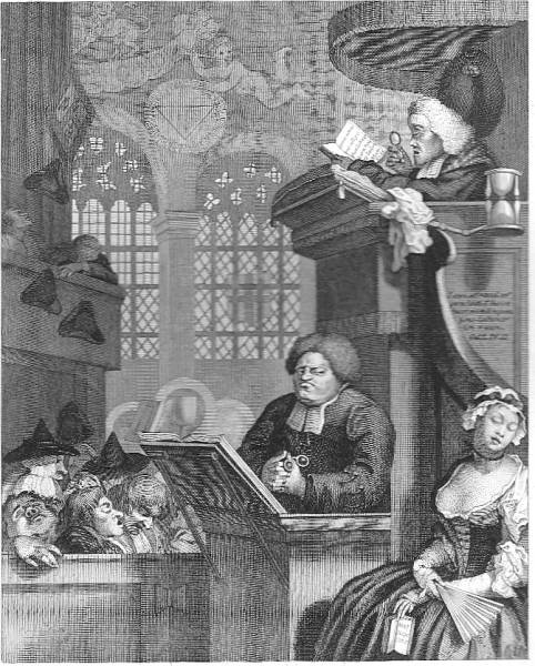 The lowest level of a triple-decker pulpit was reserved for the reading desk, at which the lay clerk led the singing and verbal responses of the service. Above the clerk’s desk was the minister’s reading desk, where a Bible, a large prayer book, and a metrical psalter were usually placed. Above this desk was the top deck, 10 feet or more above the floor, where the minister preached his sermon. Sometimes one desk served for both clerk and clergyman, and the middle tier was absent.[i]