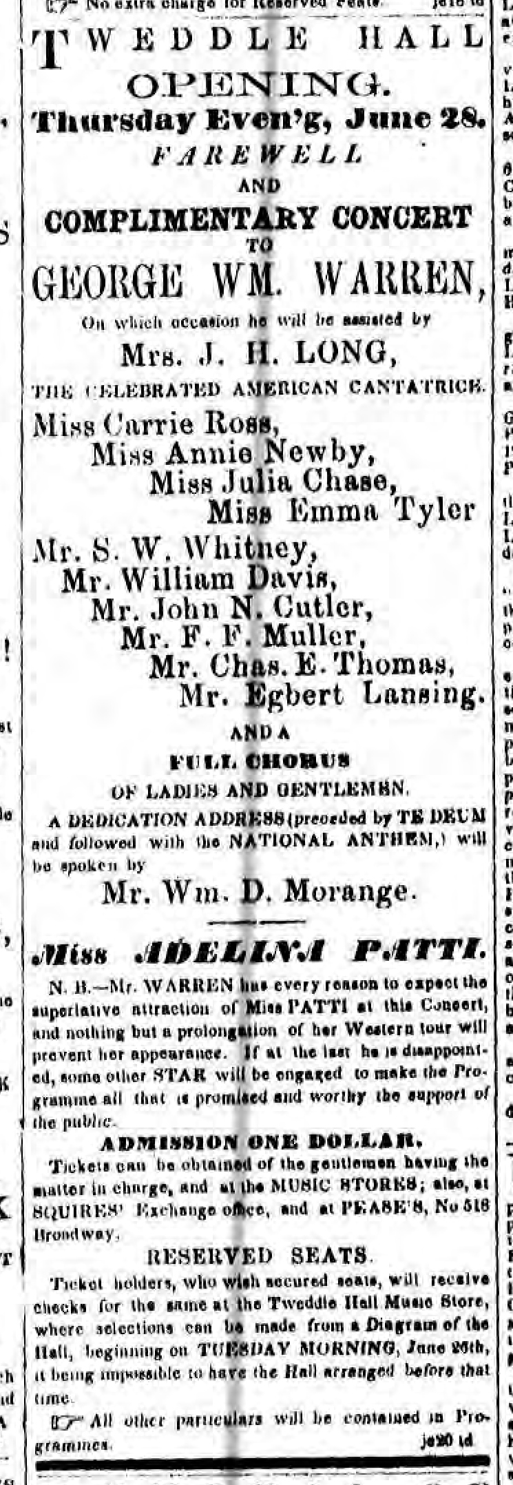 When George William Warren resigned his position at St. Paul’s in 1860, heading for his new position in Brooklyn, his native city could not bid him farewell quietly. A huge “Farewell and Complimentary Concert” was organized in Warren’s honor, to be held June 28, 1860 in conjunction with the dedication of Tweddle Hall, on the northwest corner of State and North Pearl Streets.