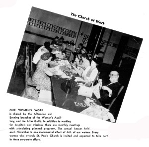 Last year, Jennifer Johnston shared with us the program from St. Paul’s 1990 production of “Fat, Fat Jehoshaphat.” Now Jennifer has made another discovery: a brochure produced over 60 years ago as part of a St. Paul’s stewardship campaign. The leaflet includes photographs of a typical Sunday at St. Paul’s, giving us a view of the state of the parish in that period.